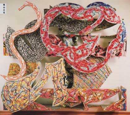 所谓“浮雕绘画”,乃是以多个不同的平面图像复叠在一起,或在平面之上附加突出画面的图像。这些复叠物呈不规则形状,可由多种不同材质拼构而成,整件作品结构复杂,大幅度突出墙面,色彩鲜丽强烈,图案多变。因画面负荷甚重,故材料多取铝金属片,切割后焊接绘制,是为绘画与雕塑结合的产品。